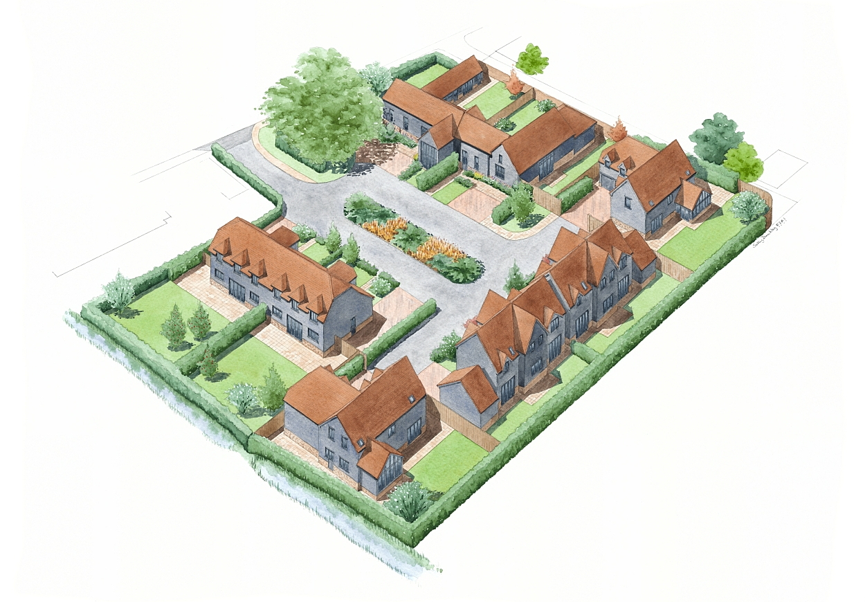 Aerial view emphasising the beautiful setting for this small group of buildings.