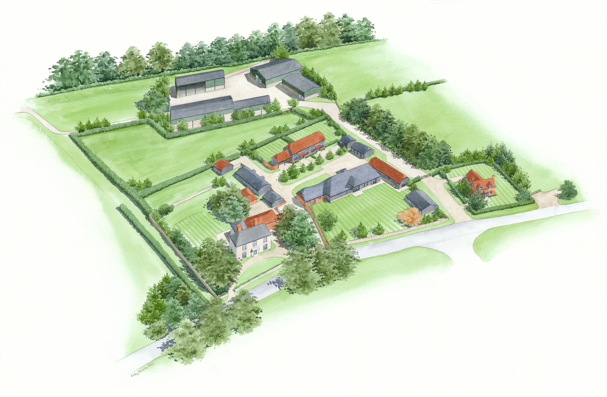 Aerial view emphasising the beautiful setting for this small group of buildings.