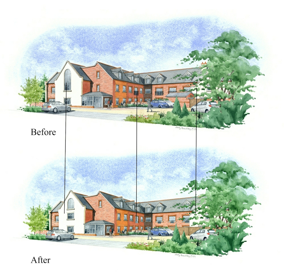 Here are some examples of enhancements to the original drawing, artist impressions created for architects to give an overview of a project. For a larger development, these views give a good overall sense of how the final project will look in its surroundings. At various stages I can offer to include or exclude background houses, alter the length of a verge with or without hedges or trees, add cars or people and so on.
