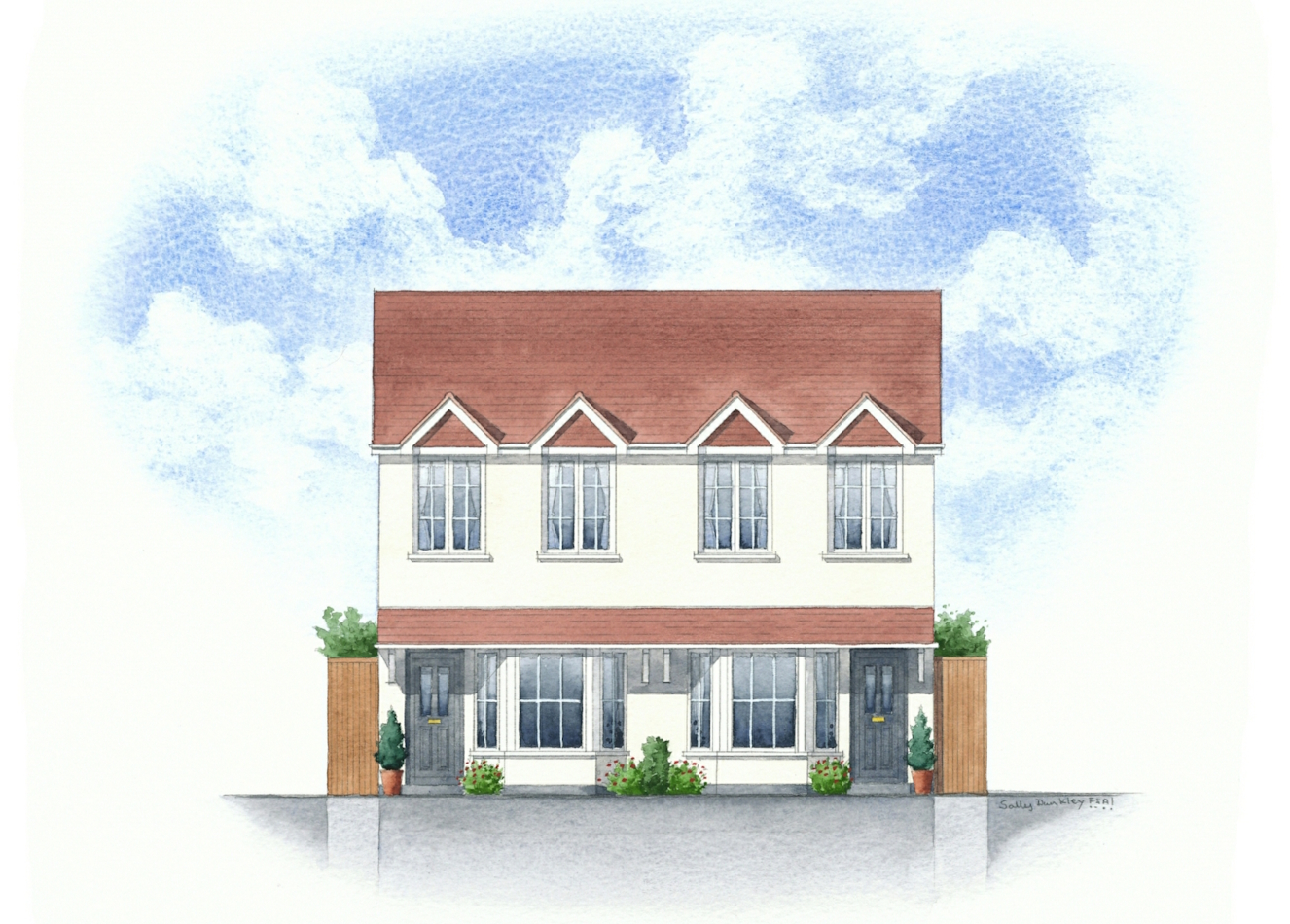 Front elevation view of a lovely three house project, situated in a quiet location. This was a well received piece of work.